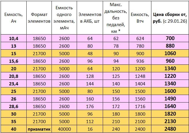 Делаем сборку литиевых АКБ для электротранспорта из новых литий-ионных элементов 18650 и 21700 от известных производителей: EVE, DMEGC, Lishen, FEB. В 2026 году используем в основном элементы DMEGC 18650/2600 мАч, 21700/4500мАч и 21700/5000мАч. Эти элементы близки по качеству и сроку службы к корейским и японским элементам и не имеют подделок. Вольтаж и емкость АКБ набираются из элементов и могут быть практически любыми. Мы делаем литиевые АКБ номиналом 12в, 24в, 36в, 48в, 52в, 60в, 72в и т.д. Емкость АКБ также находится в широком диапазоне, обычно в пределах от 5Ач до 45Ач и выше.