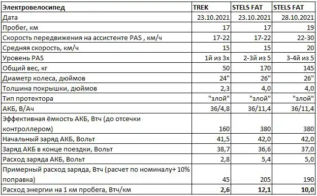 Тогда от батареи TREK можно ожидать 160Втч/2,6 = 61,5км пробега а от батареи STELS FAT — 380/12,1 = 31,4км или 380/10 = 38км при условии неизменного стиля езды и нагрузке. Почти двукратная разница в пользу TREK, который имеет более чем в 2 раза меньшую батарею. Все дело в энергозатратах!