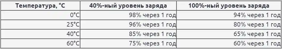 Если же вы не собираетесь использовать АКБ долгое время, вопреки бытующему мнению о хранении аккумуляторов в тепле, напротив, лучше всего литий-ионные батареи хранить (отключенными от потребителя) при температуре от 0°С до +5°С при 40–50% заряда (напряжение близкое к номиналу). Чем выше температура окружающей среды и чем ближе степень заряда к 100%, тем быстрее батарея стареет и теряет емкость.