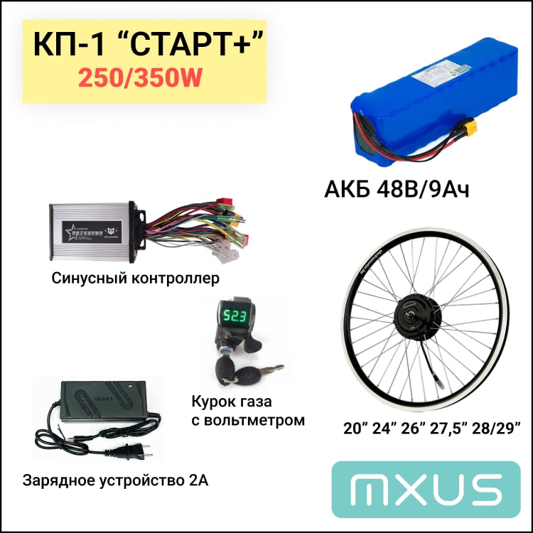 Самый доступный и простой в установке полный комплект электровелосипеда КП‑1 “СТАРТ+” со скидками, доставкой и гарантией. Можно купить в рассрочку. Данный набор мотор колесо с аккумулятором содержит все необходимые компоненты для переделки обычного велосипеда в электровелосипед, включая аккумуляторную батарею и зарядное устройство. Мотор колесо от именитого производителя MXUS. Данный производитель зарекомендовал себя надёжным и проверенным поставщиком редукторных мотор колёс. Мы сотрудничаем с производителем напрямую и можем гарантировать оригинальность продукции.